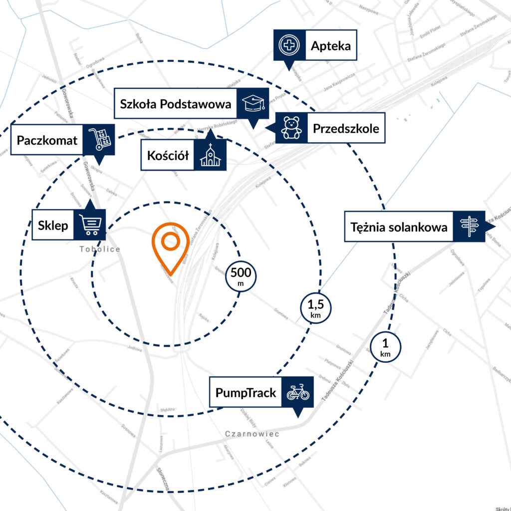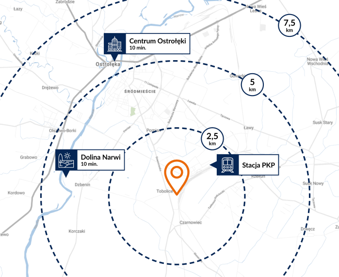 Osiedle Żeromskiego to miejsce, które oferuje bardzo komfortowy odpoczynek od codziennego zgiełku, jednocześnie zapewniając szybki dojazd do centrum miasta. Inwestycja zlokalizowana jest przy ul. Nowoczesnej oraz ul. Bliskiej w Tobolicach, które sąsiadują z Ostrołęką. Do serca drugiego z tych miast można dotrzeć samochodem lub transportem publicznym w ok. 10 minut i wygodnie korzystać z bogatej oferty handlowo-usługowej, rozrywkowej czy sportowej. Niedaleko osiedla znajduje się stacja PKP oraz kilka przystanków autobusowych. Blisko również do kluczowych tras dojazdowych, co ułatwia podróżowanie po całym regionie.